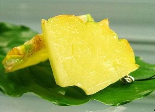 将菠萝切块,与奶油、鸡蛋、面粉等食材混合,放入模具中烘烤。出炉的菠萝蛋糕,金黄诱人,口感绵软,让人回味无穷。